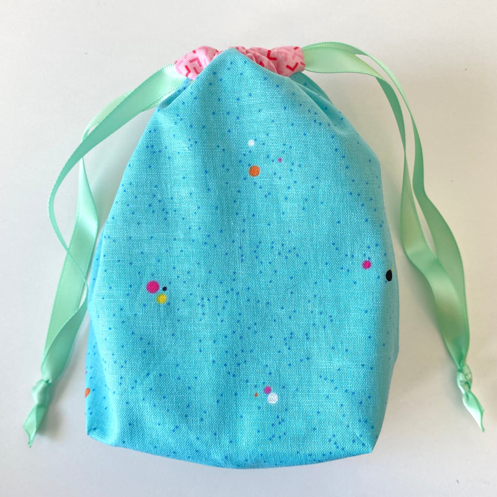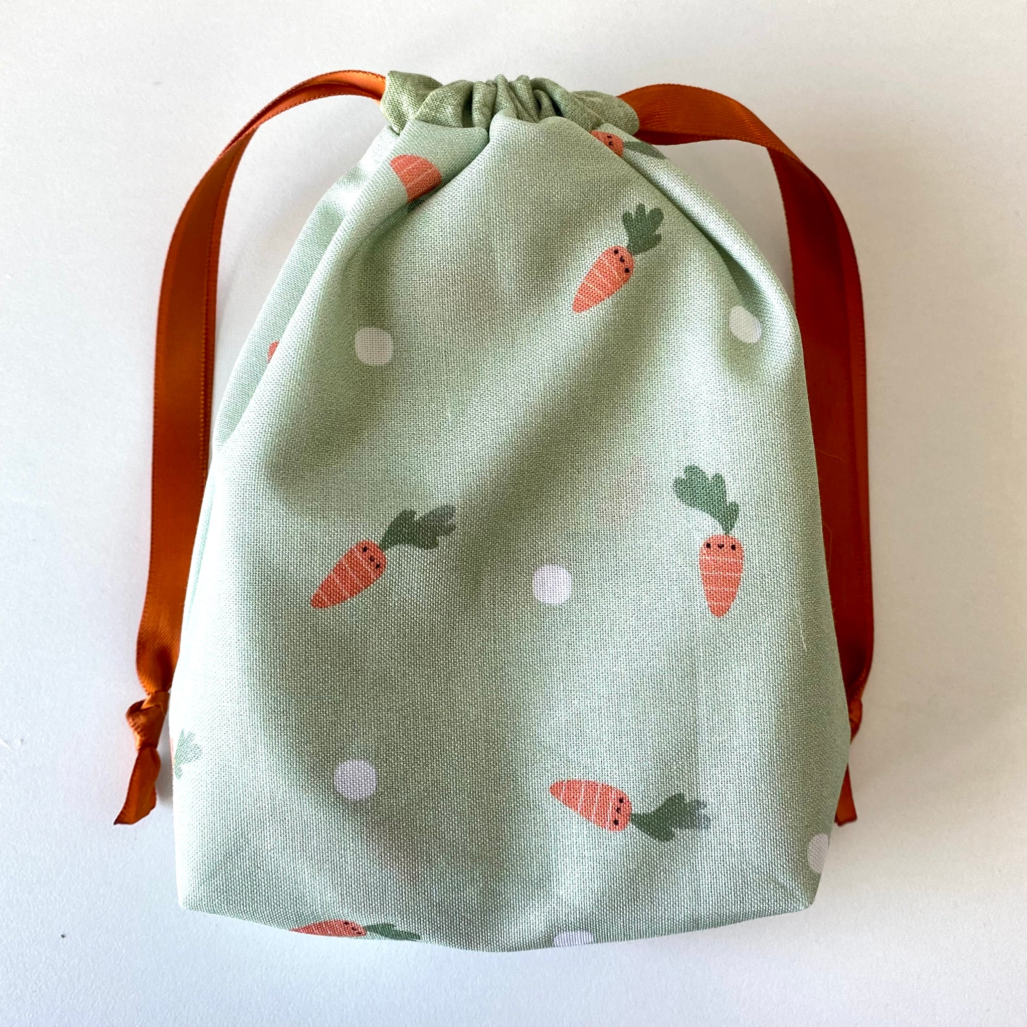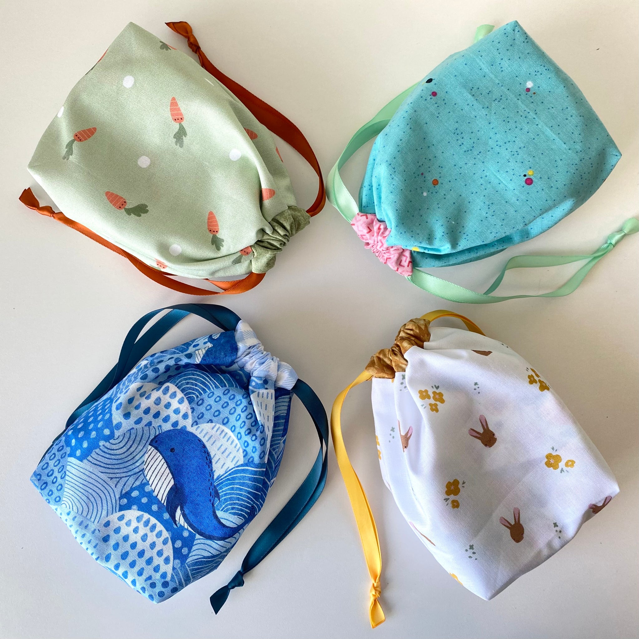 Each egg is handmade in a bright, spring-inspired assortment of prints, with no duplicate designs in each set. Designed with an envelope-style opening, they’re easy to fill with candies, small toys, or surprises. Measuring 4.5” tall x 3.5” wide. Includes your choice of coordinating storage bag.